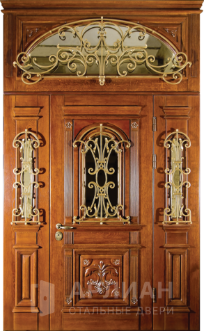 Полуторная входная дверь с элементами ковки и стеклом №72